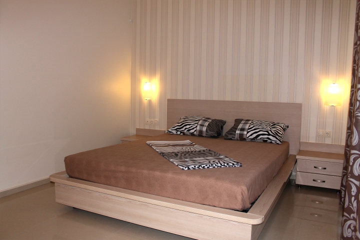 В номере находится большая двуспальная кровать, прикроватные