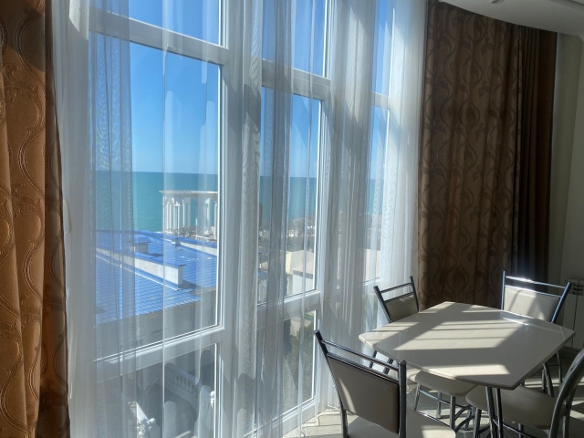 Просторная гостиная с 2-мя мягкими диванами, обеденной зоной и панорамными окнами . Уютная спальня с комфортной кроватью, шкафом купе, сейфом, трюмо и балконом с видом на море. В каждой комнате есть кондиционер и телевизор.